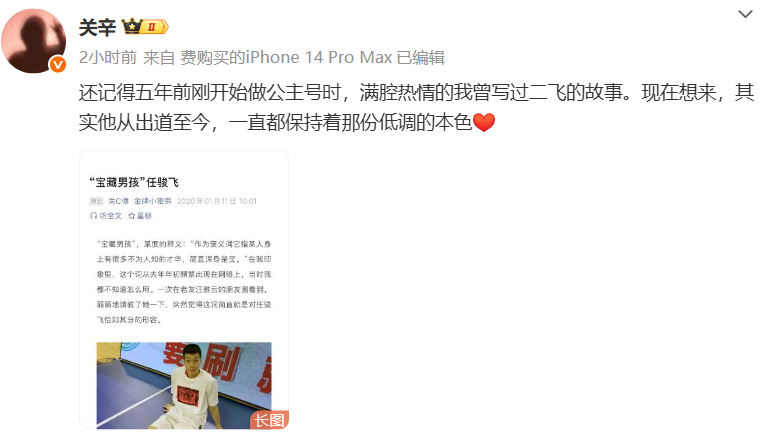 随后关辛还晒出了当年他为二飞写的一篇文章,以他的视角向球迷们解释二飞突然选择退出的原因——他一直以来就是这么低调。这也印证了二飞的退役并非是突然决定的,而是一早有安排的。